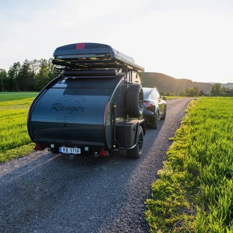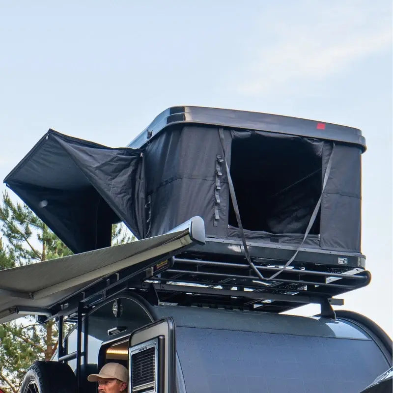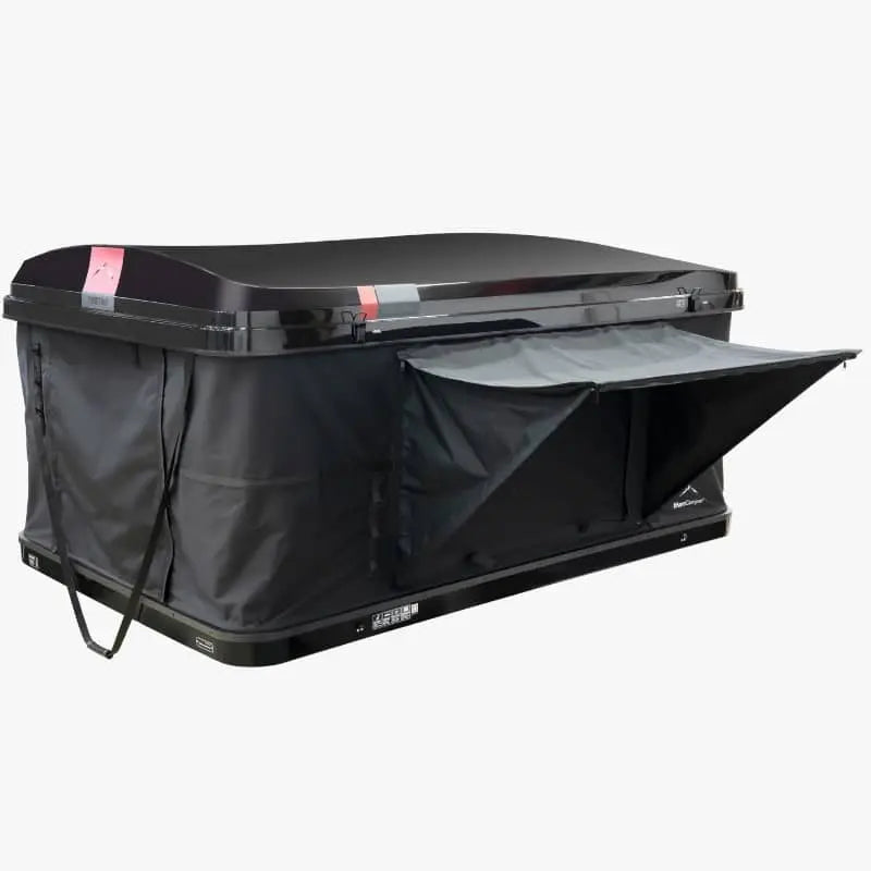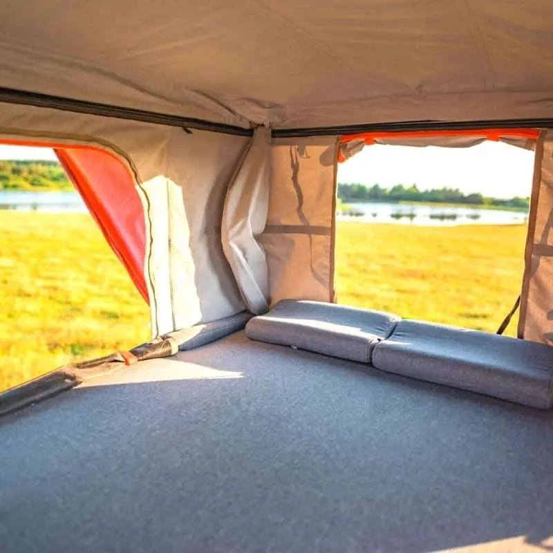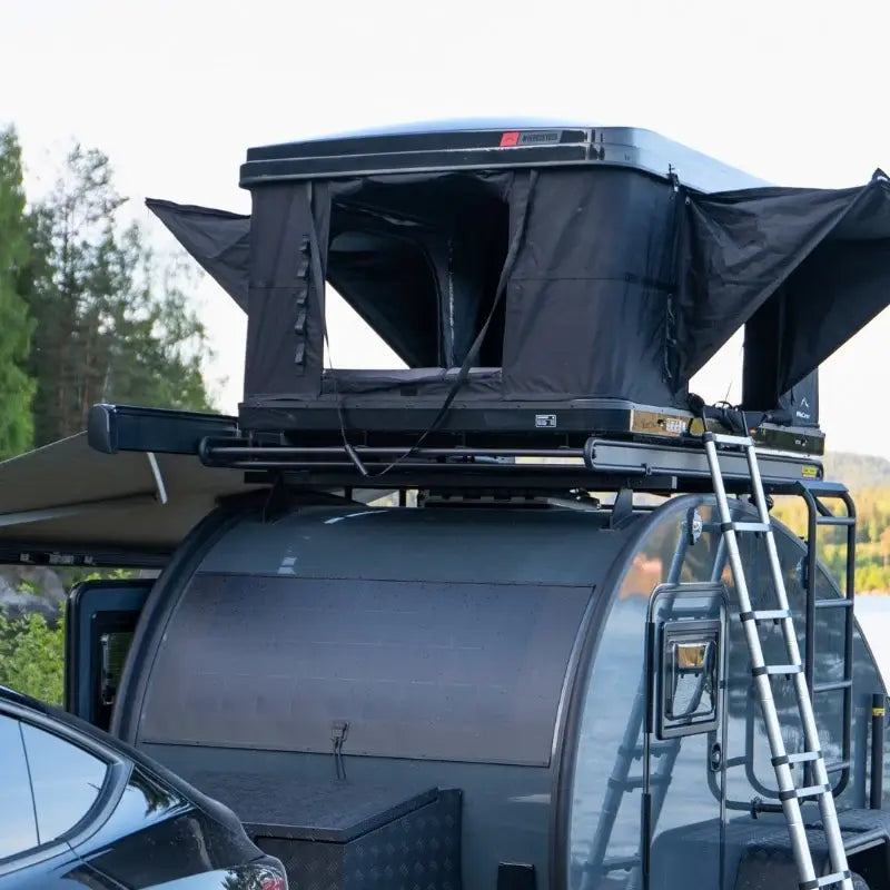 Verticale daktent met geïntegreerde verlichting. Dit boxmodel daktent heeft een extra dik matras en heeft ook ingeklapt ruimte voor slaapzak en kussens.
