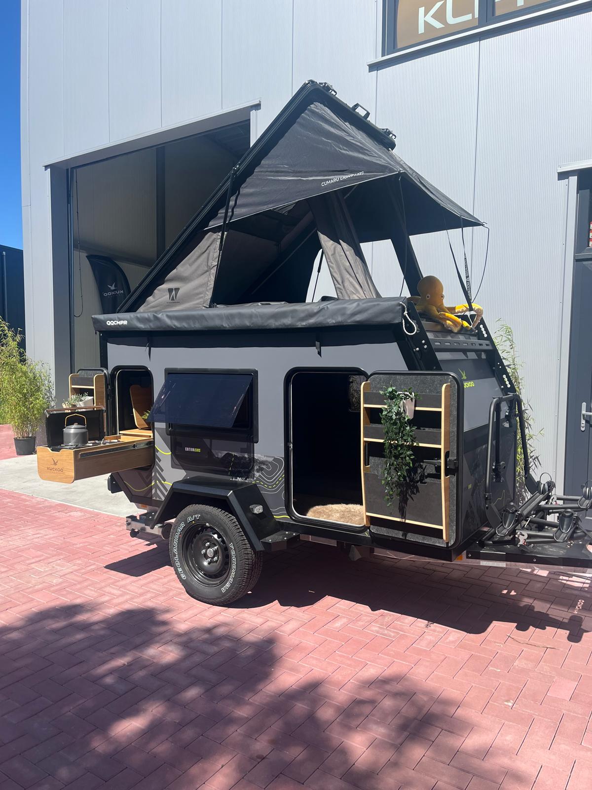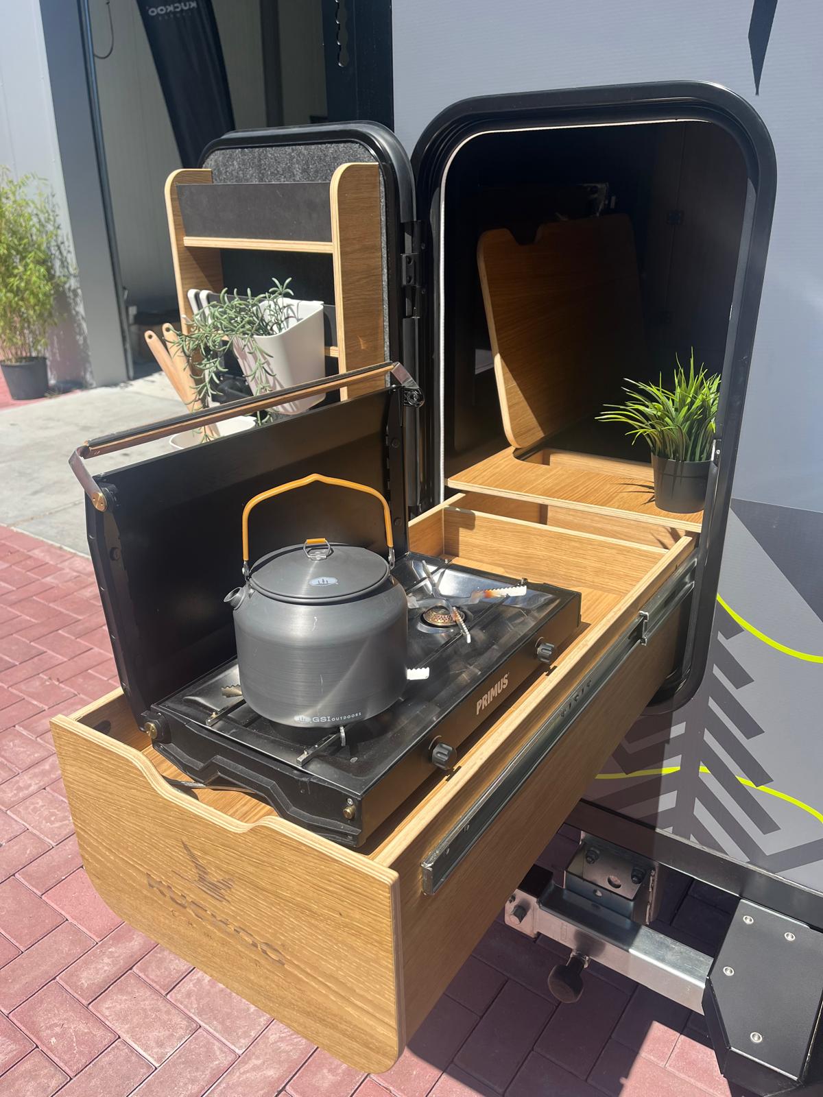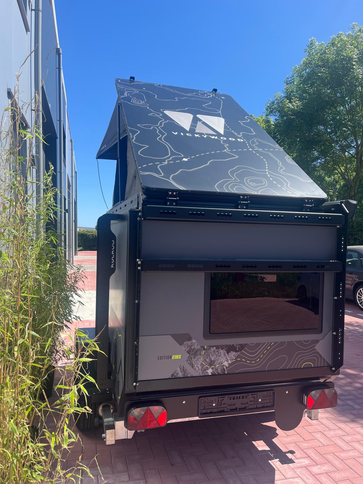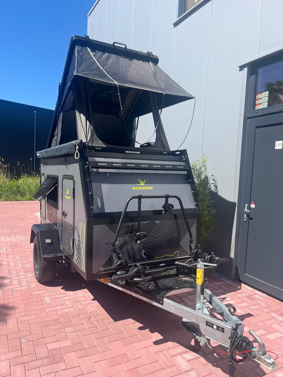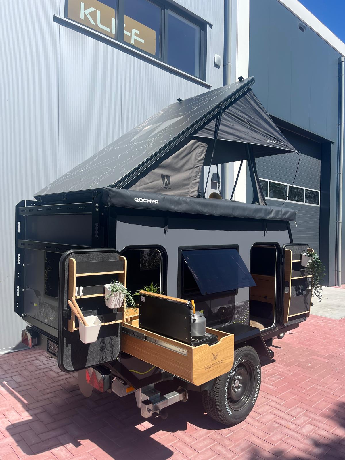 - QQCMPR luifel. Praktische luifel gemonteerd aan de zijwand van de Kuckoo Camper Max. Geeft zowel schaduw als beschutting bij minder weer.