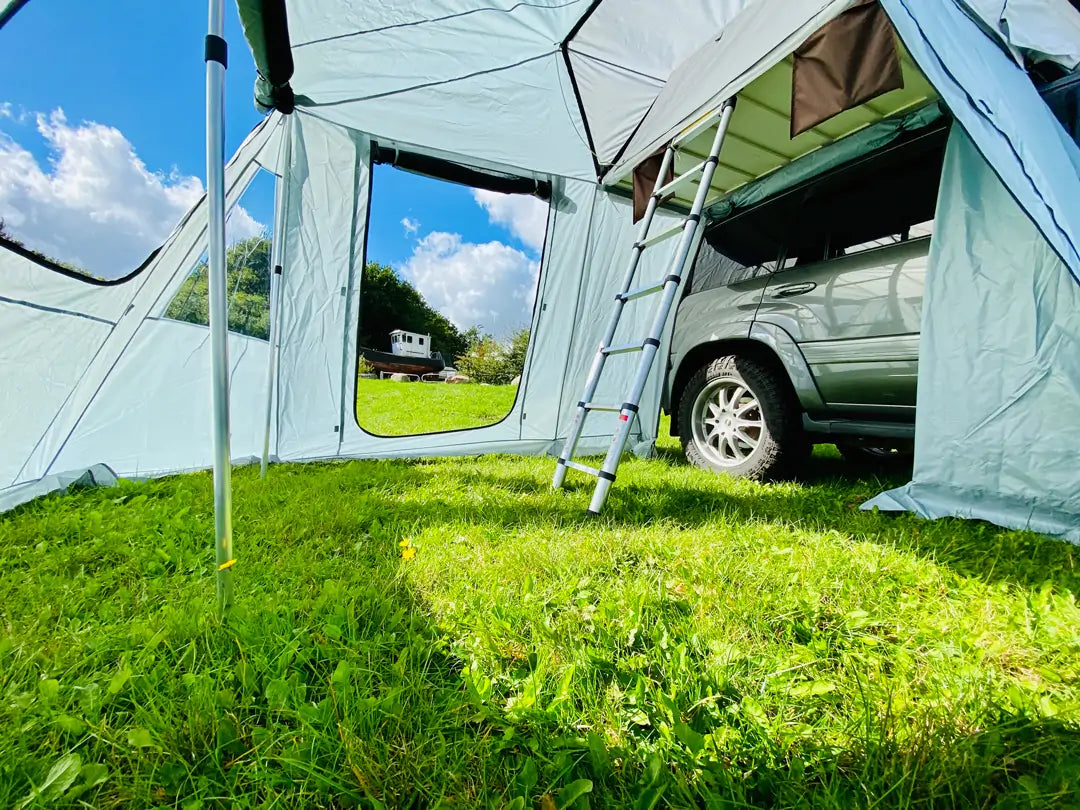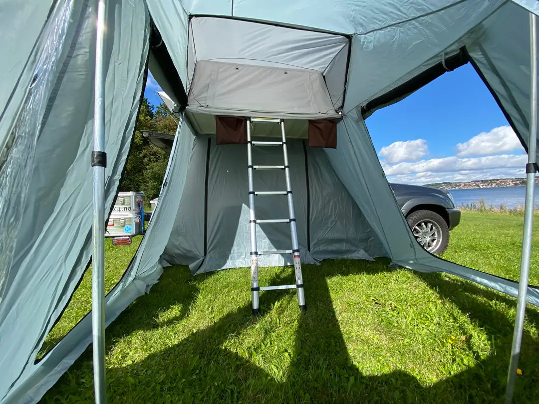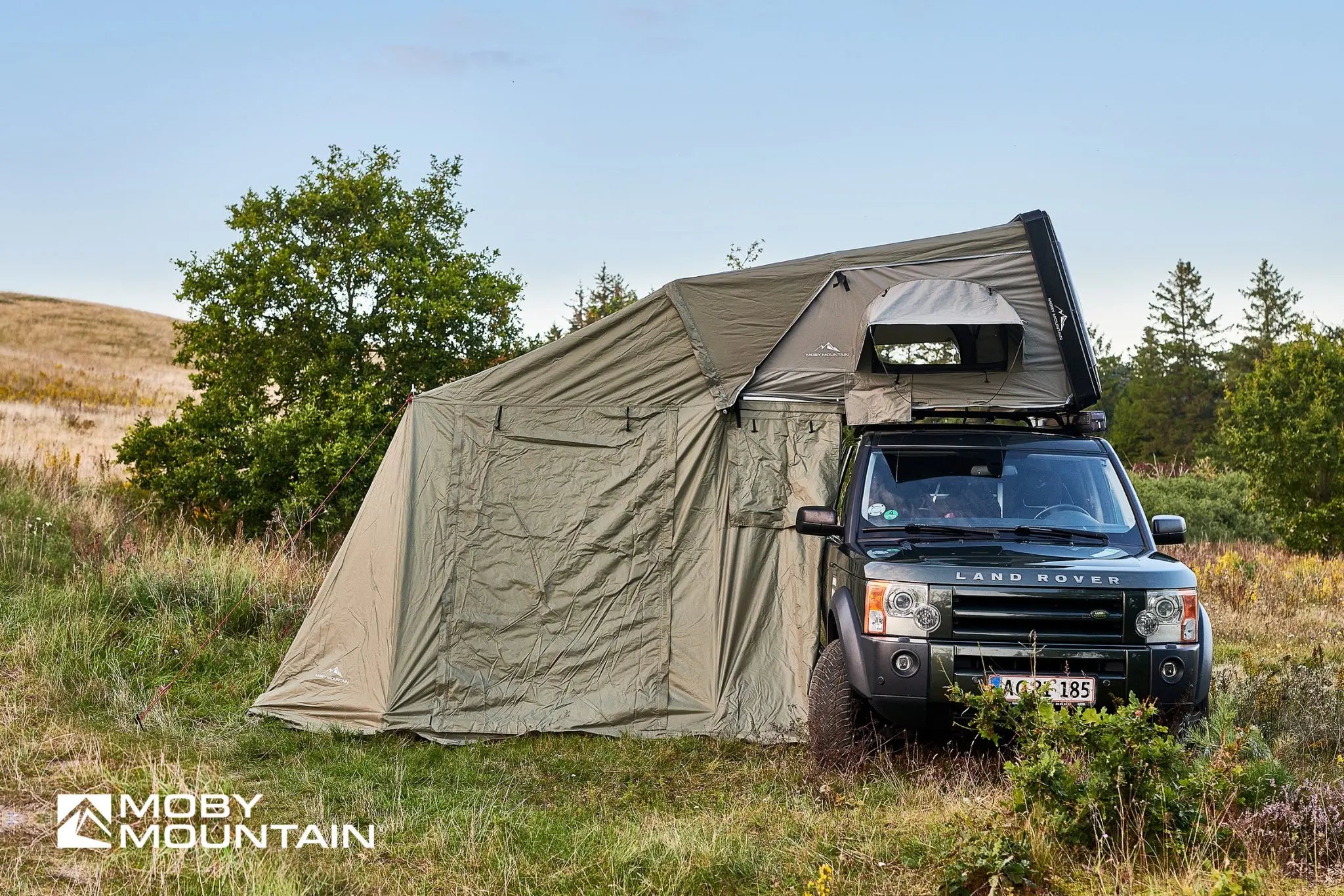 Wanneer er behoefte is aan meer beschutting onder de daktent, kan deze eenvoudig worden uitgebreid met een annex. De annex biedt een ruim leefvertrek met plaats voor bijvoorbeeld een tafel, stoelen en extra opbergruimte.