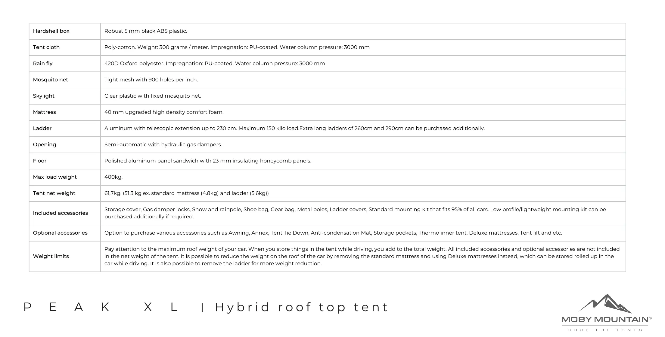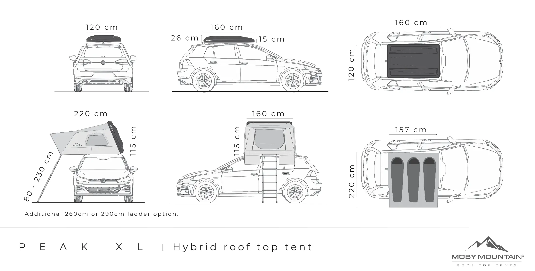 De Peak XL is ontworpen voor spontane avonturen en biedt plaats aan twee volwassenen en één kind, of tot wel drie volwassenen. Voor grotere behoeften is er de Peak XXL, die plaats biedt aan maximaal vier personen.