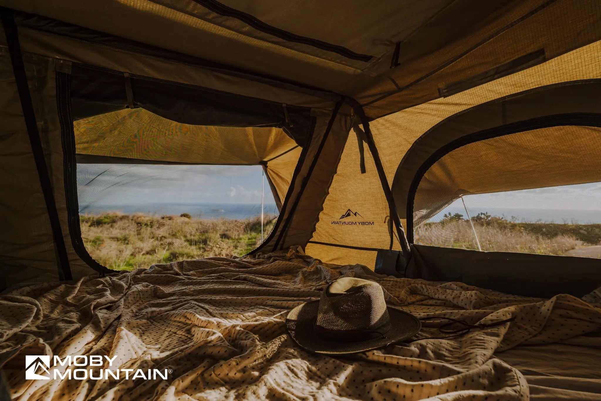 De daktent is uitgerust met een dakramen en zijramen voor uitstekende ventilatie en voldoende daglicht. Wanneer de nacht valt, kun je vanuit elke hoek genieten van een prachtig uitzicht op de sterrenhemel.